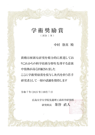 学術奨励賞(広島大学大学院先進理工系科学研究科)