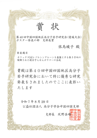 支部長賞 ポスター発表の部: カリックス[4]レゾルシンアレーンを基盤とする巻き方向の制御された超分子らせんポリマーの合成, 依馬綾子