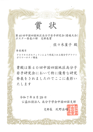 支部長賞 ポスター発表の部: テトラキスポルフィリンにより形成される超分子グラフトポリマーのナノ構造, 佐々木菫子