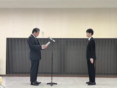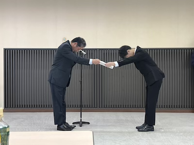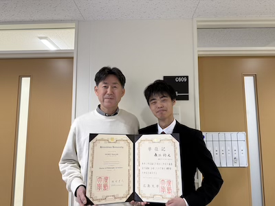 森江将之くんに博士の学位が授与されました。 令和7年度学位記授与式が開催され、当研究室の森江将之くんに博士の学位が授与されました。また、広島大学理学部化学科同窓会より、博士賞が授与されました。おめでとうございます。今後のご活躍を期待しています。。